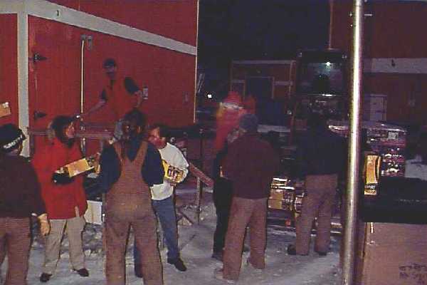 human chains, passing the cases from one to the next, off the pallets and