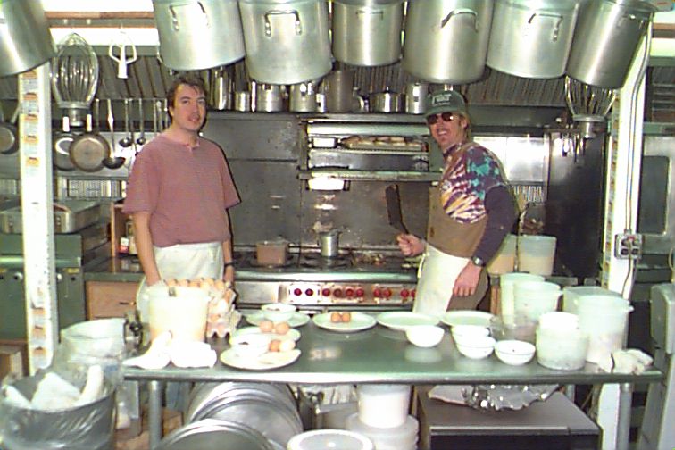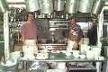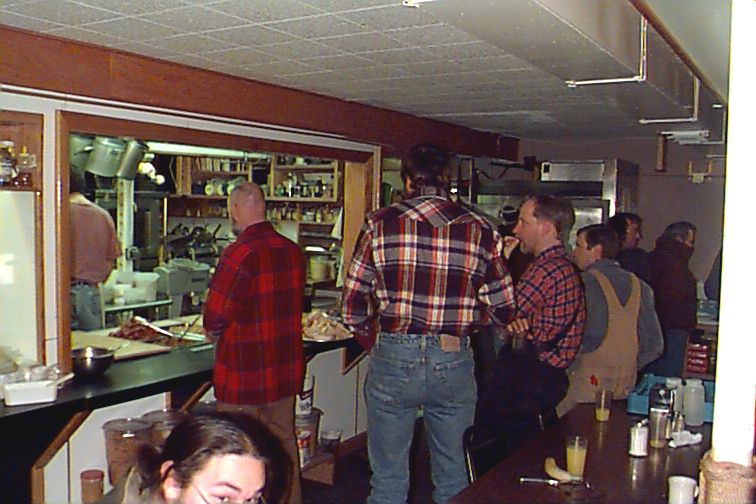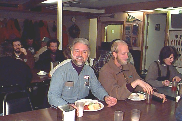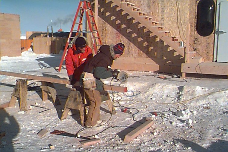 I have finally figured out a clothing regimen that works for me, for what I am doing. At first I wore way too much: too bulky, too hot. Then, once, I got cold. Now I have settled on the following menu. Firstly, 'conventional' underwear: cotton boxer shorts and t-shirt. Next, a set of NSF-issue long underwear, ankles to wrists, light brown color, some kind of lightweight synthetic material. Then, NSF-issue heavy wool boot socks, and the flannel-lined jeans that I bought at home. These go into the huge white bunny boots and I am warm enough from the waist down. On top, a thin turtleneck shirt, dark blue, and finally a blue chambray work shirt, with the script-cursive red embroidered oval namepatch 'Tony'. I look exactly like a gas station attendant or a maintenance man, but it is practical and fashionable in this milieu. More than one person has commented on the usefulness of the name patch: there are a lot of transient personnel, scientists and engineers and so on, and no-one knows who anyone else is. Now, all kinds of people know me: 'Hey Tony, pass the sugar please' and so on. For going outside, I wear the NSF-issued black zip-up fleece underjacket, enough in itself for short trips between buildings; and finally the bright red official parka. My Russian-style fur hat goes over the very necessary UV goggs, the fleece jacket zips up over my chin, and I am ready to Step Out in South Pole Style. They issued me with a zillion different pairs of gloves: I have found that I only need the lightweight fuzzy-lined tan leather pair, but I carry the knit undergloves to keep fingers warm when taking pictures.