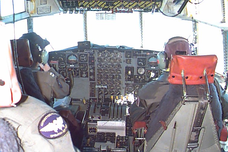 up front; the flight engineer sitting behind them; the radio man on one