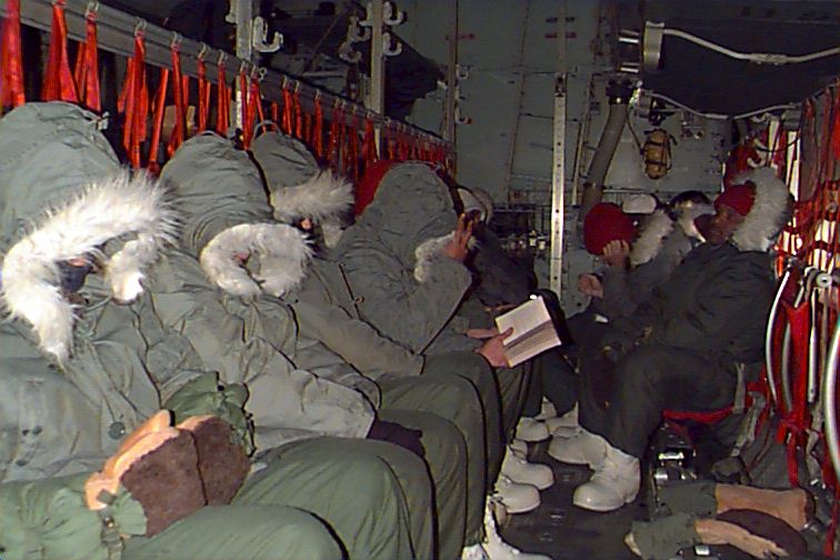 The co-pilot is a woman, and there are maybe seven out of 30 passengers who are women. They are dressed in military cold weather gear identical to the men, and look as capable as any of their colleagues. It is good to see that women have comparable opportunities for these kinds of challenging assignments - I guess that has been one of the great equalizers of the modern military. That certainly wasn't the case in Russia.