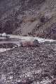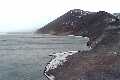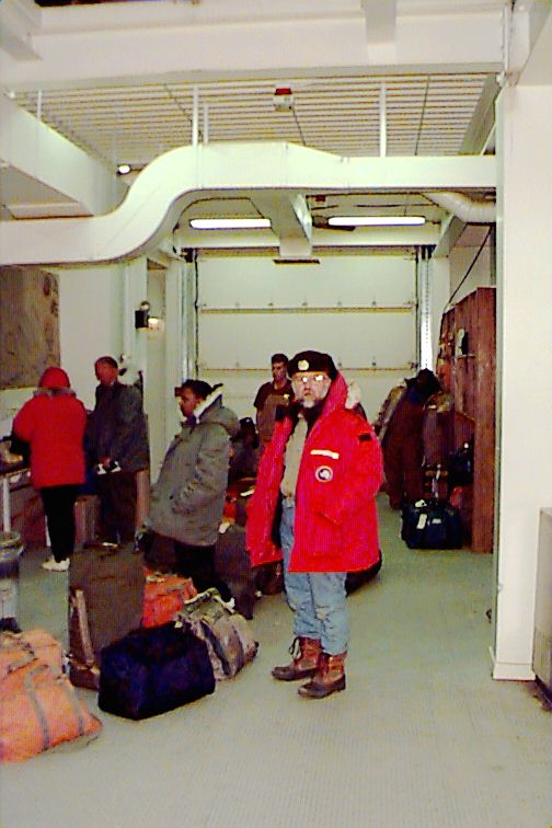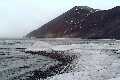 The wind gets stronger, the temperature drops a few degrees. Since I have the time, I inquire about visiting Scott's Hut. This small wooden building was erected at the turn of the century and served as a base for early Antarctic operations for about a decade. After abandonment, it gradually filled with snow and ice until it was 'excavated' a while ago and restored as a registered Historic Monument. It's less than half a mile from town, and the key is kept at the NSF office. Another guy wants to go, so I sign out the key and we set off into wind. We walk past the pier, from which I boarded the icebreaker for that wonderful cruise a couple of weeks ago. Then, the pier area was covered with a mountain of shipping containers, mostly containing sorted waste being retro'd to the States. Now, the pier is empty and clean: those Navy crewmen, with whom I flew down, put in their work when the cargo ship arrived, had a few beers, and have already returned. The research vessel "Nathaniel B. Palmer" is at the dock, taking on supplies, but there are no tours this time, so we walk by.