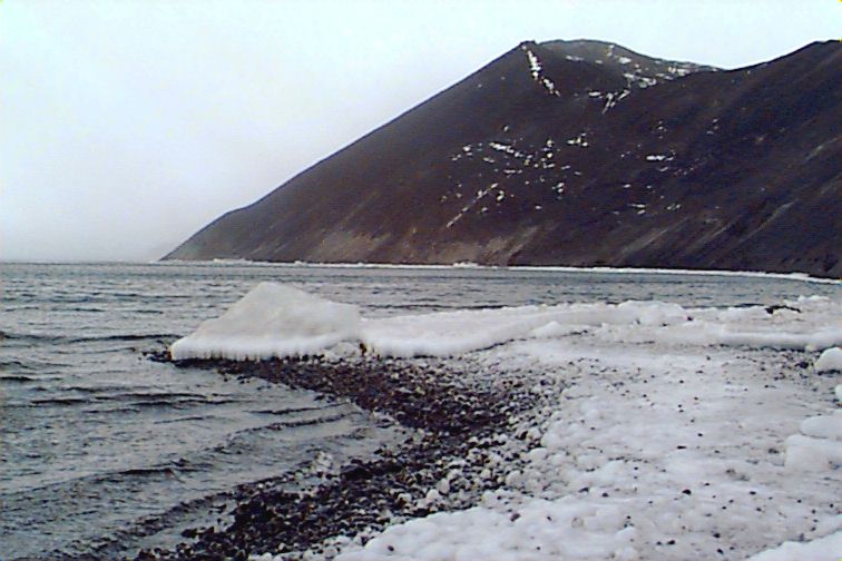 ice-rimmed beach into cloud covered tops. The wind howls above my head,